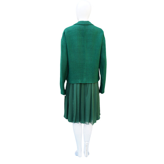 PRADA GREEN BOXY JACKET AND SILK SKIRT SUIT