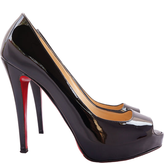 CHRISTIAN LOUBOUTIN 120 MLLE DAM PATENT LEATHER PEEP-TOE PUMPS