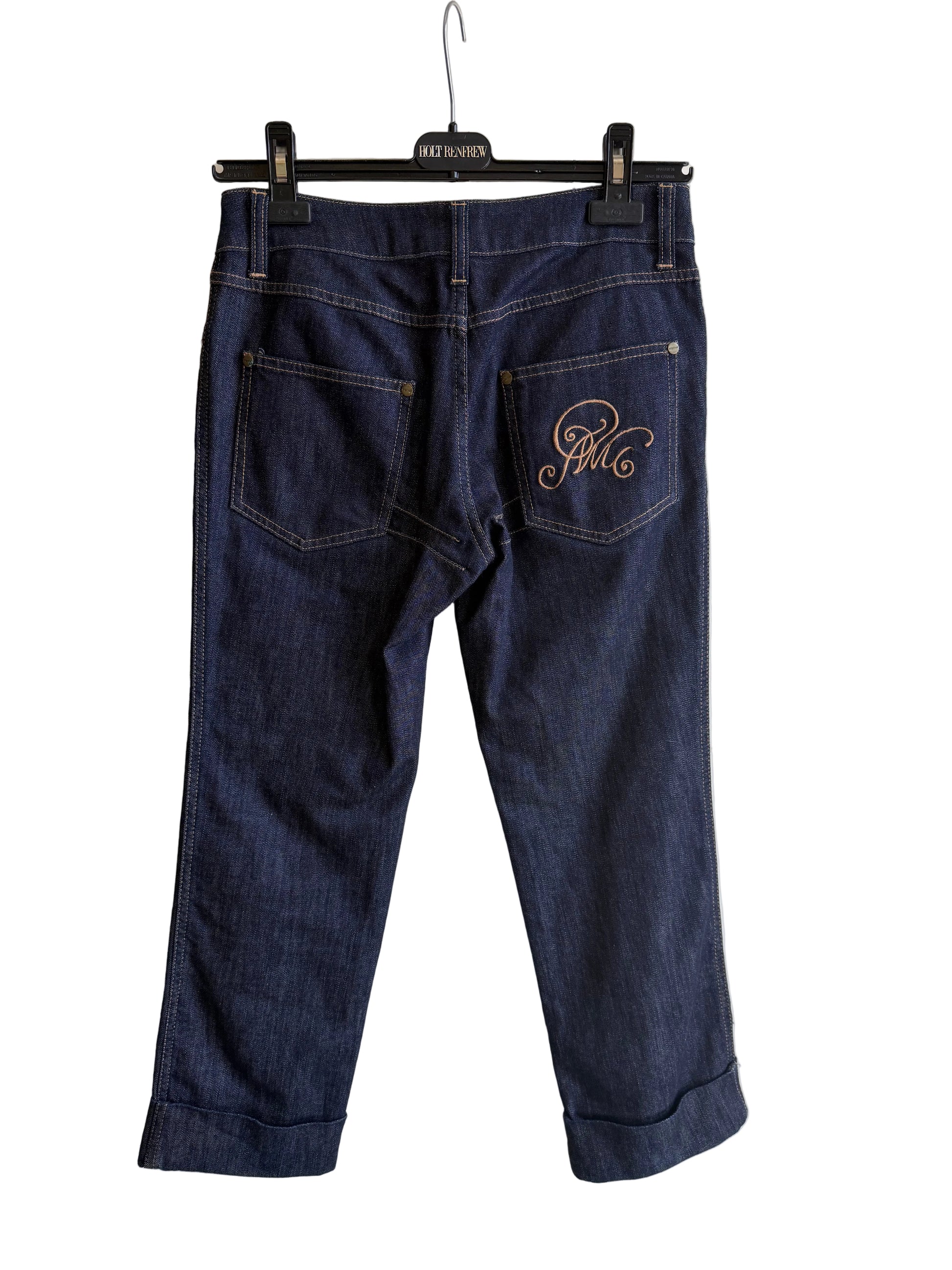 Alexander McQueen cropped jean, five pockets, cuffed bottom, button and zipper closure at front.
