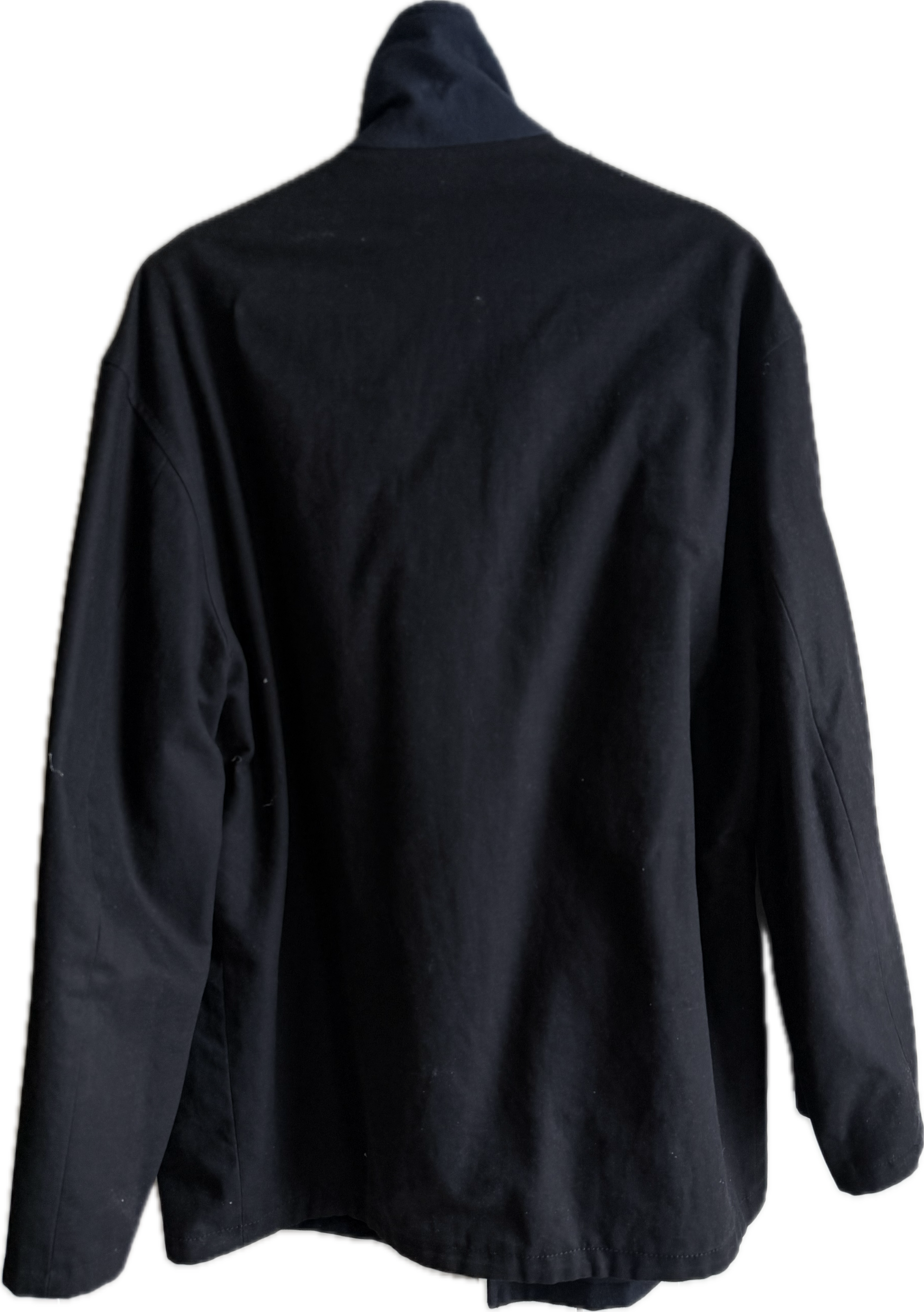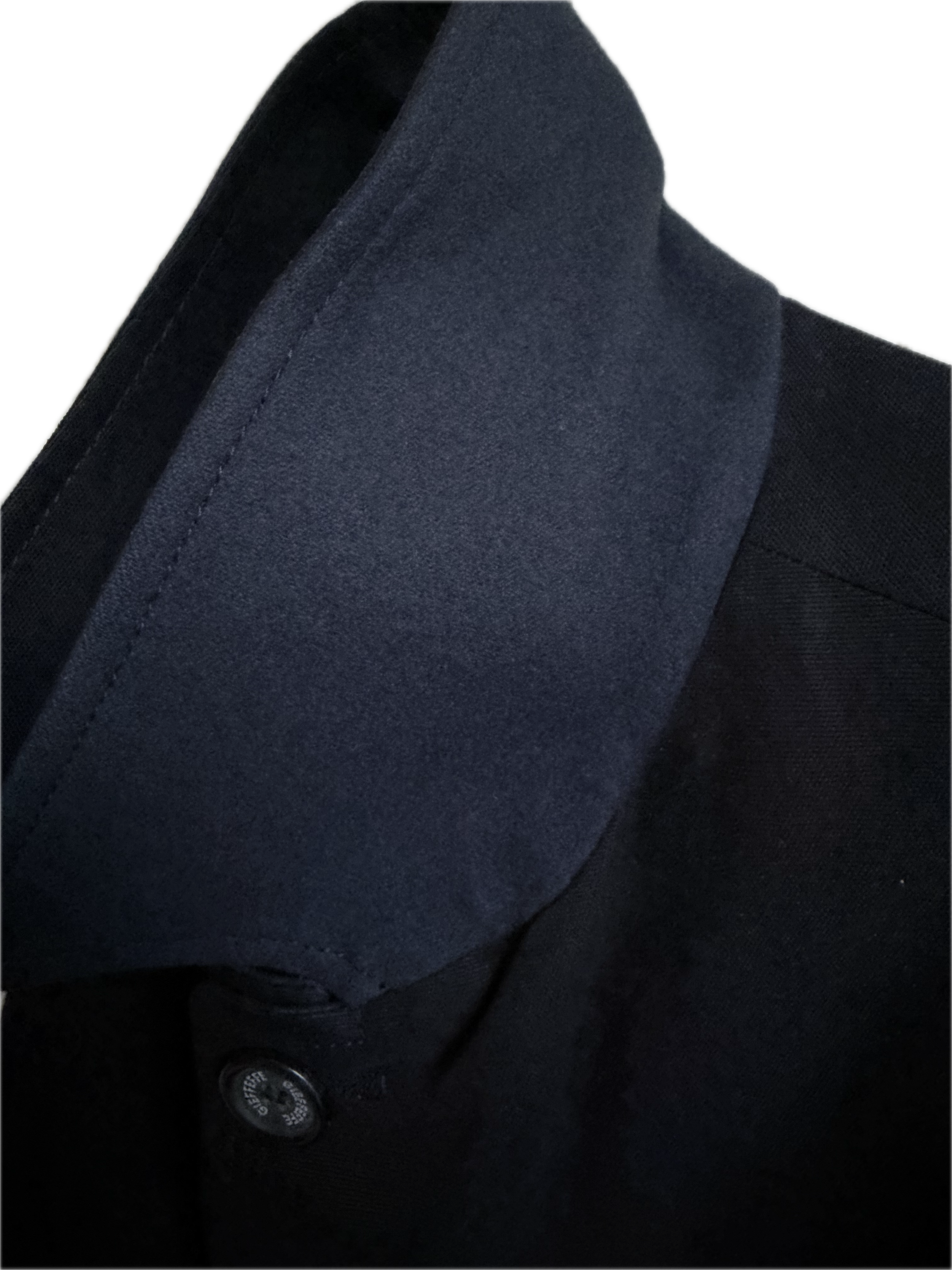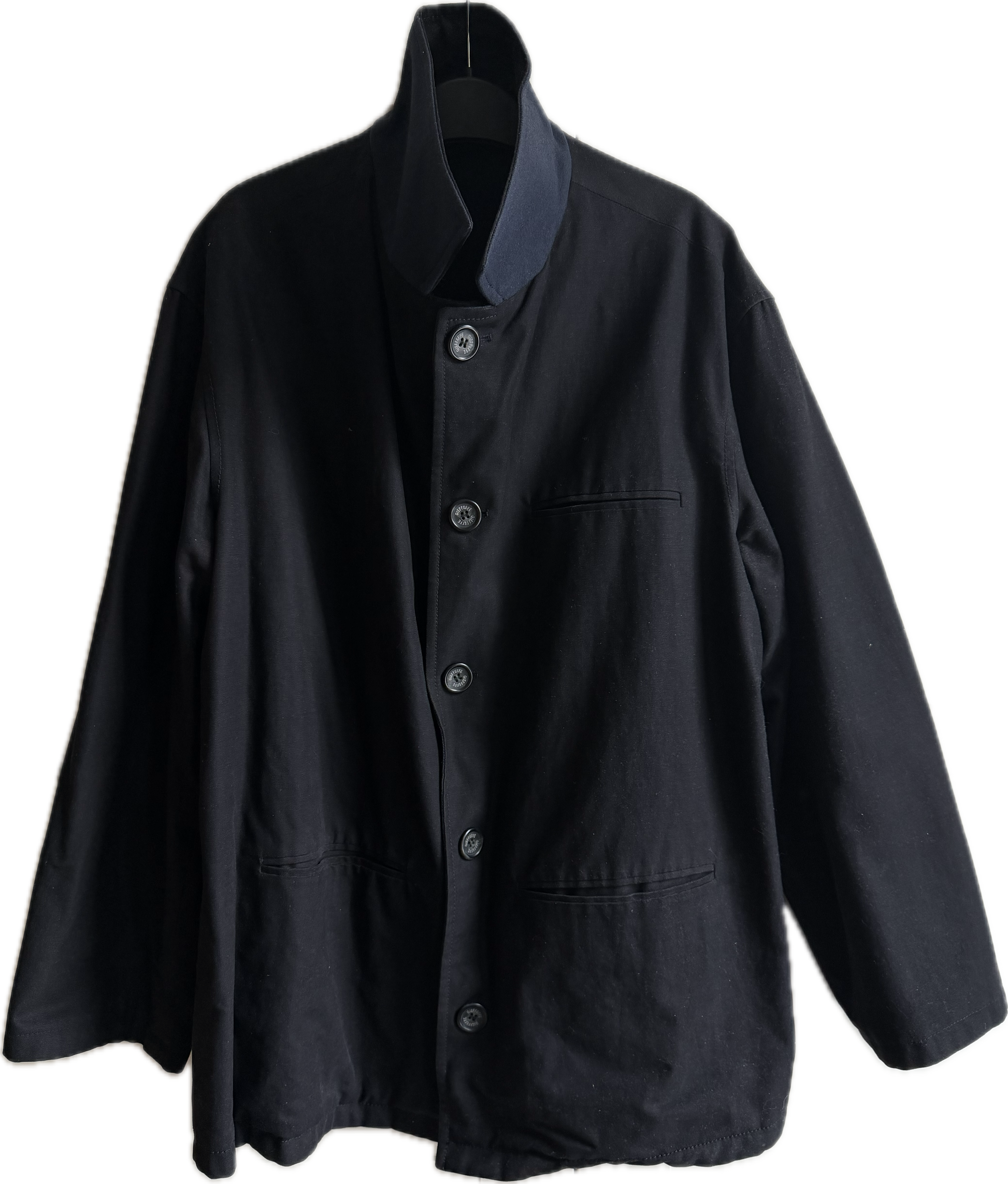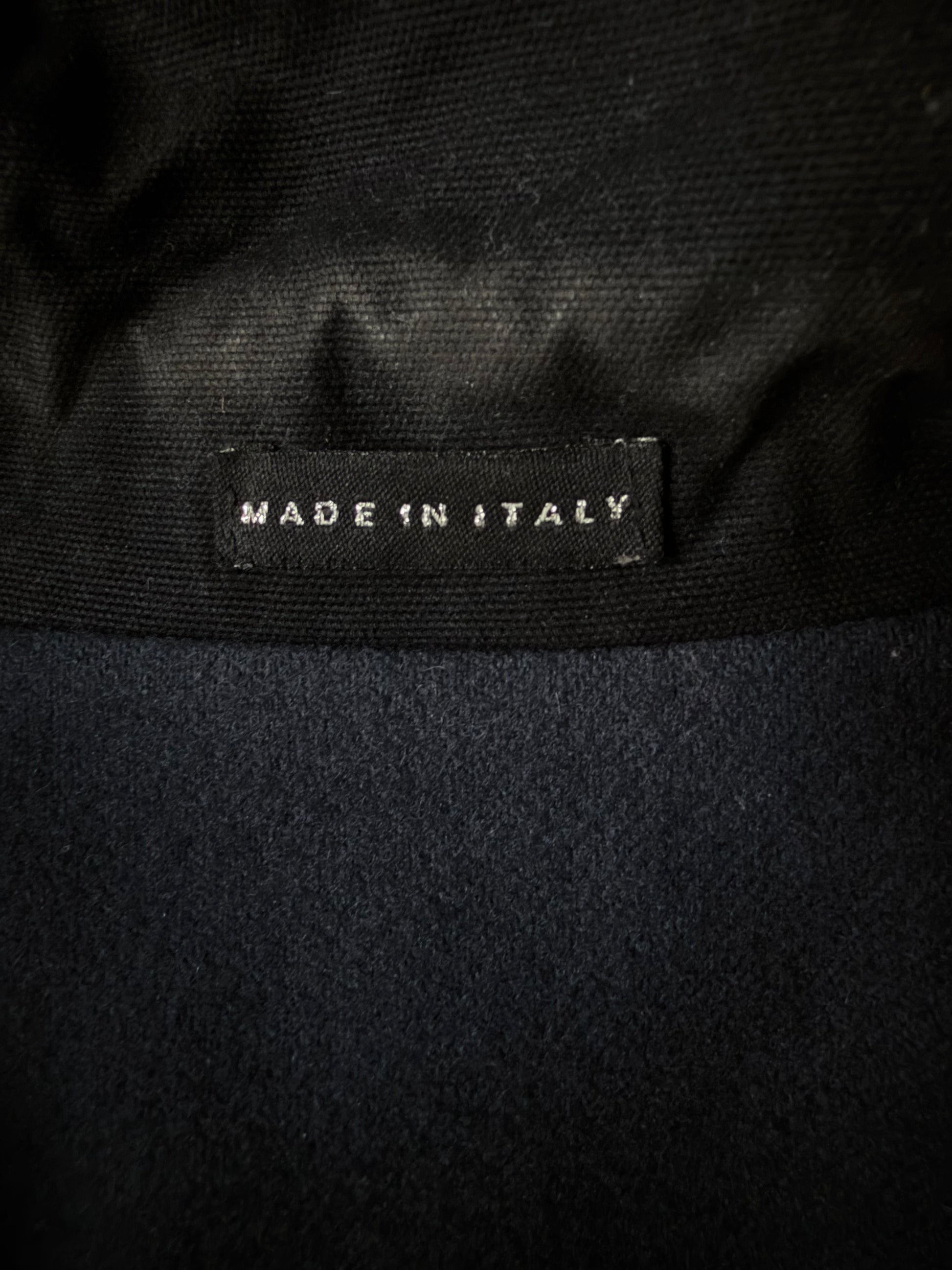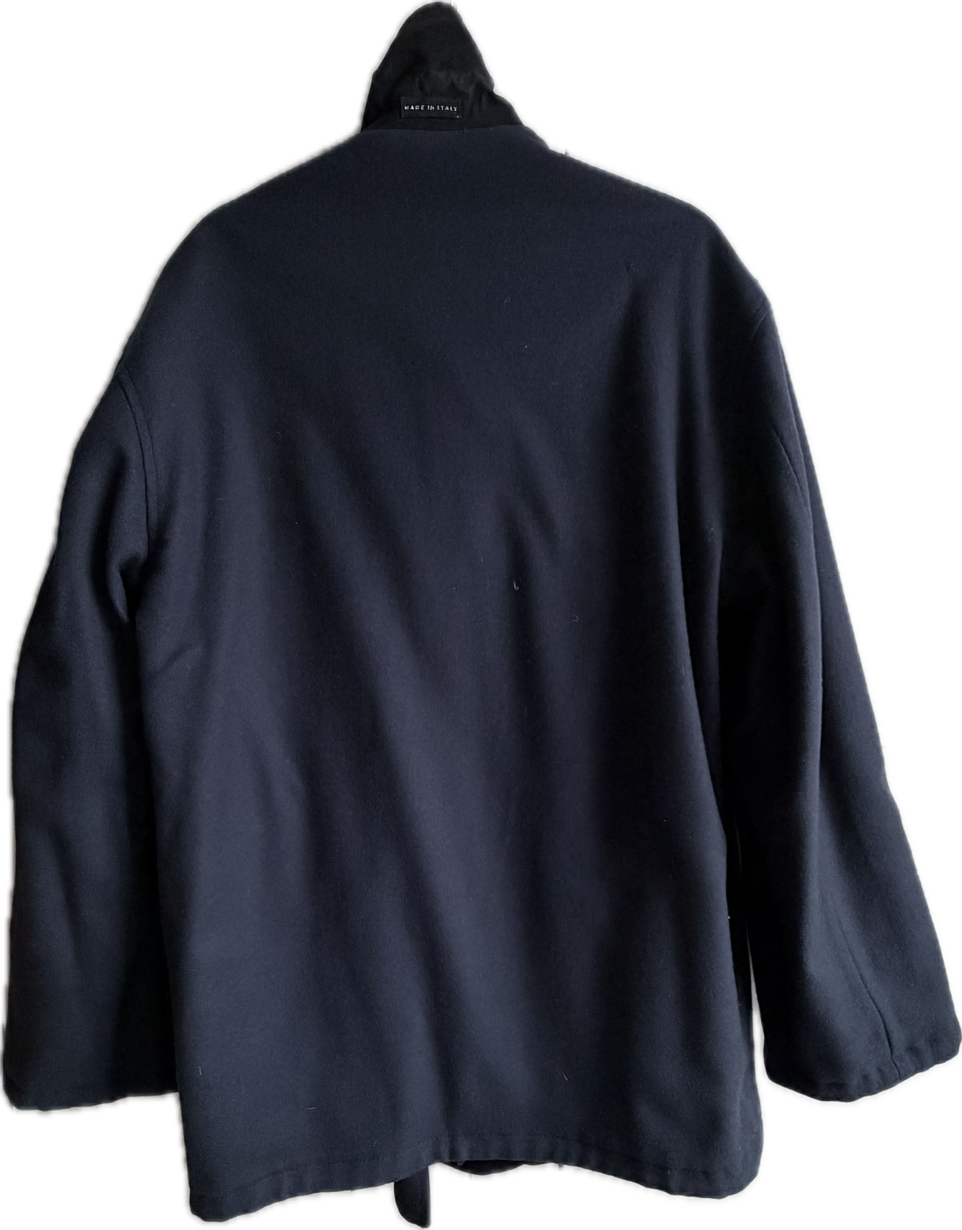 Gieffeffe barn jacket; reversible with dark blue black and navy inside. Navy interior wool and dark blue back is cotton denim.