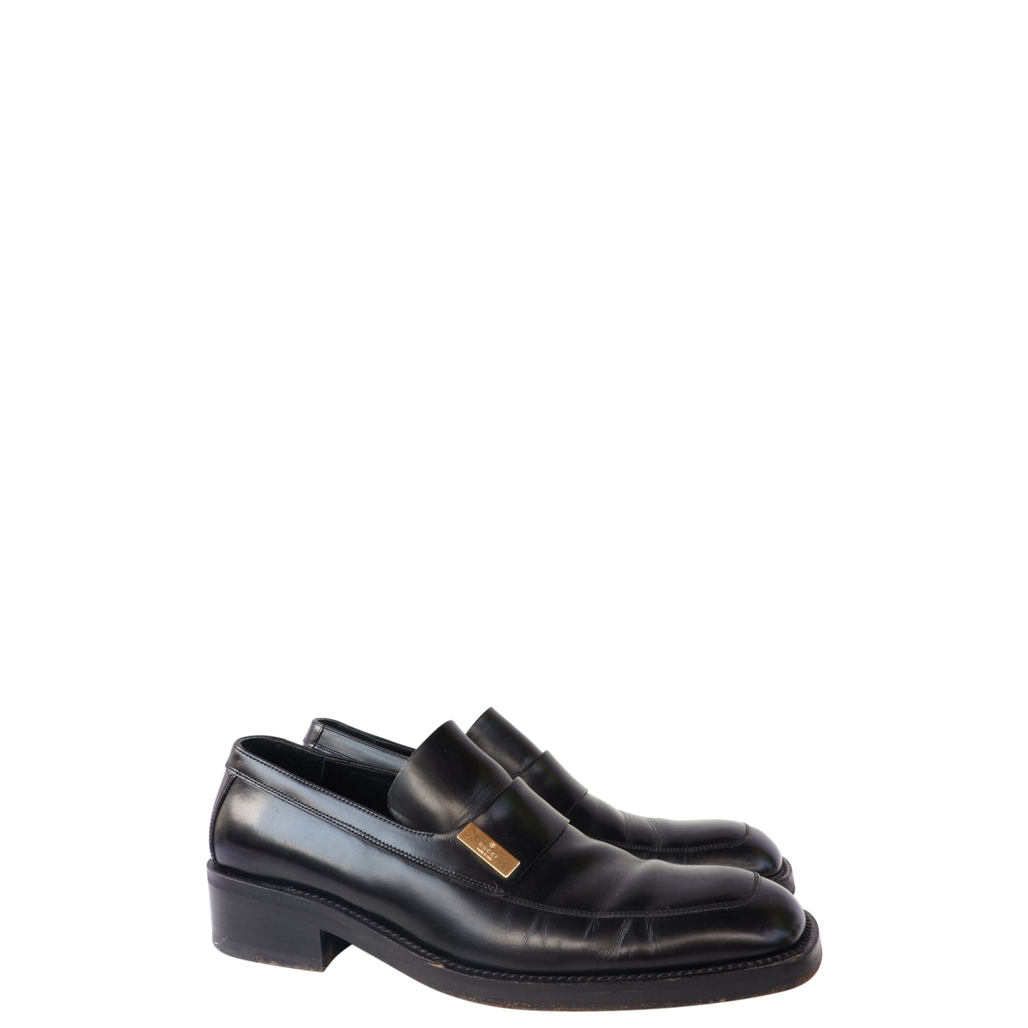 Gucci black leather slip-on loafers; gold logo placard on side with leather soles.