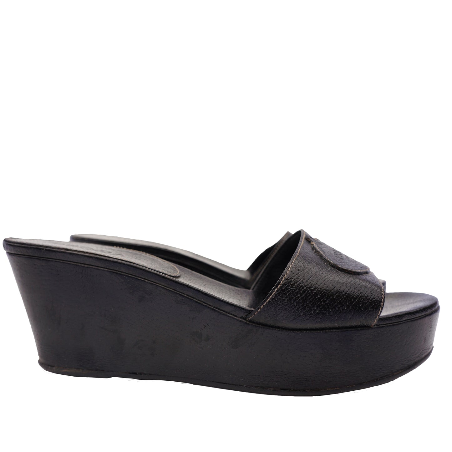 Condition: BC - light over creasing of leather throughout; rubbing in certain areas of leather insole; scuffs along the leather platform; creasing along platform; light wear to soles.